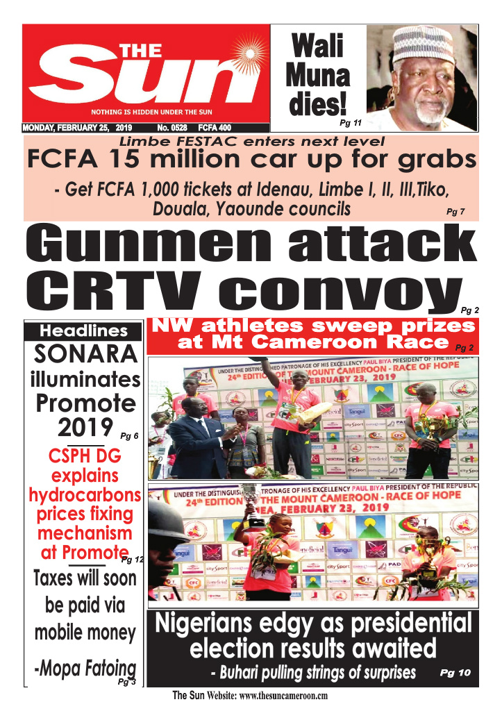 Le journal the Sun Cameroun, Créé en 2006 avec l\\\'autorisation ministérielle n ° : 930 / G.37 / L9 / 1 / Vol.9 / T / OAPP, le Sun News Paper Cameroon est l\\\'un des principaux journaux anglais du Cameroun. Basé dans la région du Sud-Ouest Cameroun et précisément dans la ville de Limbé. Sur le plan politique, The Sun est proche du Parti conservateur. Ses journalistes et rédacteurs en chef primés à travers le pays trouvent les histoires, grandes ou petites qui importent le plus aux Camerounais chez nous et à l’étranger. Retrouvez dans le Journal the Sun toute l’actualité Politique, économique, sociale, … Du Cameroun.” Dion NGUTE says Biya is now ready to download”; “Royal reception Franck talk!! PAUL Biya, Denis Mukwegue, Fru Ndi, Bolloré » … Dans le journal the Sun, on nous parle de toutes ses personnalités et leurs impacts dans notre société. Tout savoir dans les prochaines éditions du journal The Sun.